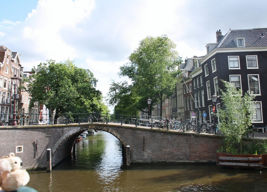 Kiko is having a good time along the canals in Amsterdam (Netherlands)