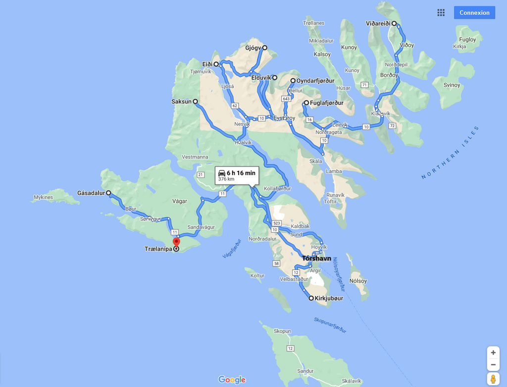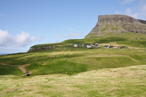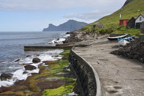 Eiði se trouve au nord-ouest de l’île. Nous avons commencé sa visite par un point de vue qui fait face à l’entrée nord du Détroit Sundini, qui se jette entre deux falaises, offrant un panorama époustouflant. Une maisonnette verte semble perdue au milieu de cette immensité. Puis, nous avons rejoint le port, situé dans une faille de la falaise, et constitué de deux digues. Une jolie barque en bois typique reposait sur une rampe d’accès. Perchée à flanc de colline, une cabane coiffée d’un toit de tourbe semble monter la garde sur les lieux. Nous nous sommes ensuite rendus sur une plage de galets entourée de falaises qui s’étend au cœur d’un cadre idyllique. Derrière, le lac Niðara Vatn renvoie le reflet des montagnes qui s’élèvent au-delà du village. Malheureusement, elle est connue pour être localement le théâtre du Grind, tradition jugée impitoyable et barbare par certains, qui consiste à chasser les globicéphales en les emmenant à s’échouer sur le rivage, pour être ensuite massacrés. L’odeur de putréfaction des cadavres qui pourrissaient là était pestilentielle. En quittant le village en direction du nord, nous nous sommes arrêtés au bord d’une route côtière pour admirer le Géant et la Sorcière (Risin Og Kellingin), deux étonnantes formations rocheuses. Selon la légende, ils seraient arrivés d’Islande sur le site durant la nuit. Ils trouvèrent tant de beauté dans les Îles Féroé qu’ils décidèrent de les haler vers leur pays. Alors, ils entourèrent la Montagne Eiðiskollur d’une corde et commencèrent à les remorquer. Mais ils ne virent finalement pas le temps passer, et lorsque les premiers rayons du soleil les atteignirent, ils furent transformés en pierre.