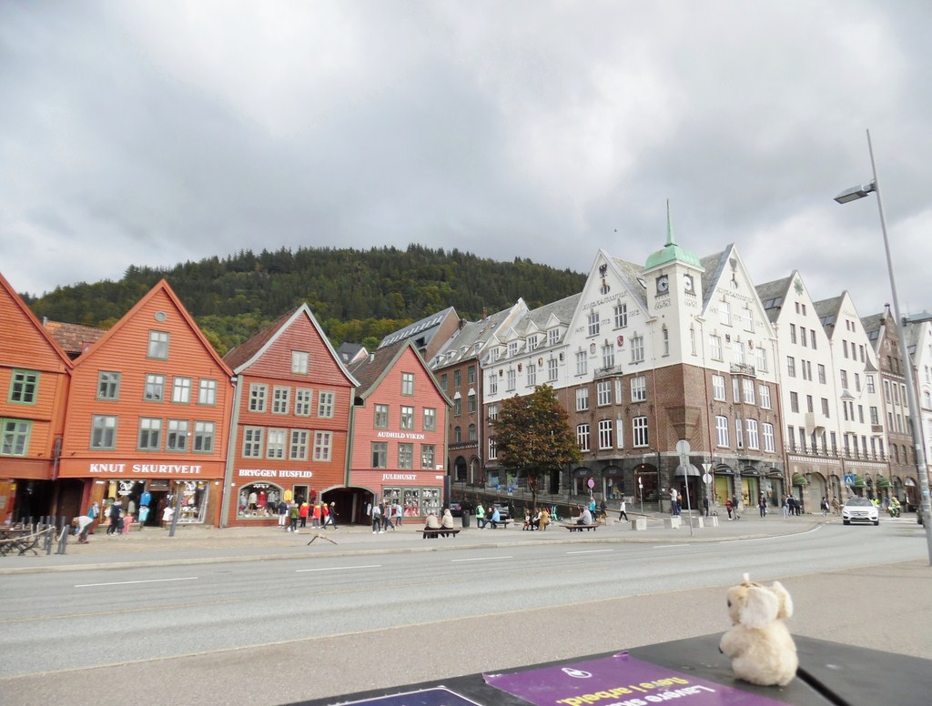 Kiko admire les maisons de bois colorées du Quartier Bryggen à Bergen (Norvège)