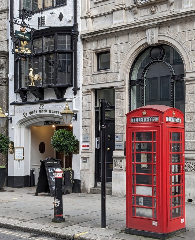 Cabine téléphonique devant Ye Olde Cock Tavern - Temple