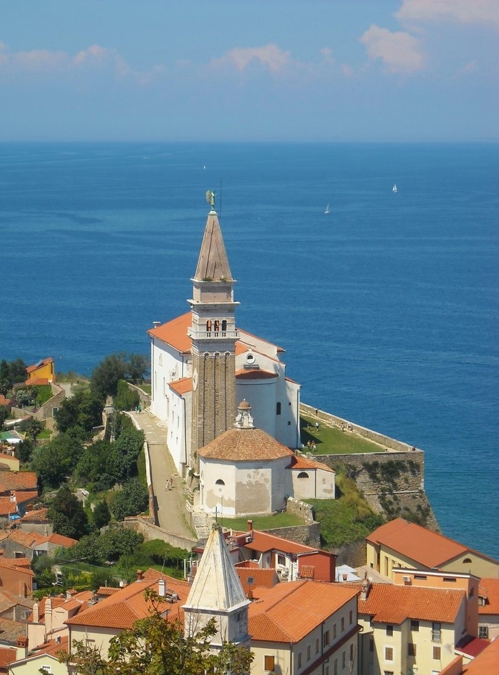 Piran (photo) est la plus belle ville du littoral. Les influences vénitienne et gothique s'y mêlent, proposant une architecture hors du commun. D'ailleurs, on y parle autant l'italien que le slovène. Et pour cause : Piran fut vénitienne du XIIème au XVIIIème siècle. Elle est très préservée et on ne peut accéder au Centre Historique en voiture. Il faut se garer sur un parking payant à quelques centaines de mètres de la cité pour la rejoindre à pied. Le stationnement est également possible dans les hauteurs, mais trouver une place peut s’avérer très difficile surtout en période touristique. Ses petites ruelles et ses maisons colorées sont pleines de charme. Elle dispose de bâtiments médiévaux, qui ont été restaurés à partir des années 1980 comme à Ptuj. La Place Tartinijev et son Hôtel de Ville Néo-Classique, le port de plaisance, les églises et leurs ex-voto marins, le monastère et le baptistère en sont les principales attractions. Cependant, il serait dommage de ne pas s'aventurer dans les hauteurs afin d'admirer les toits de la ville, dont la curieuse silhouette aiguë et saillante semble plonger dans l'eau très bleue de l'Adriatique. En effet, elle a été construite sur un étonnant éperon rocheux qui s’avance dans la mer.