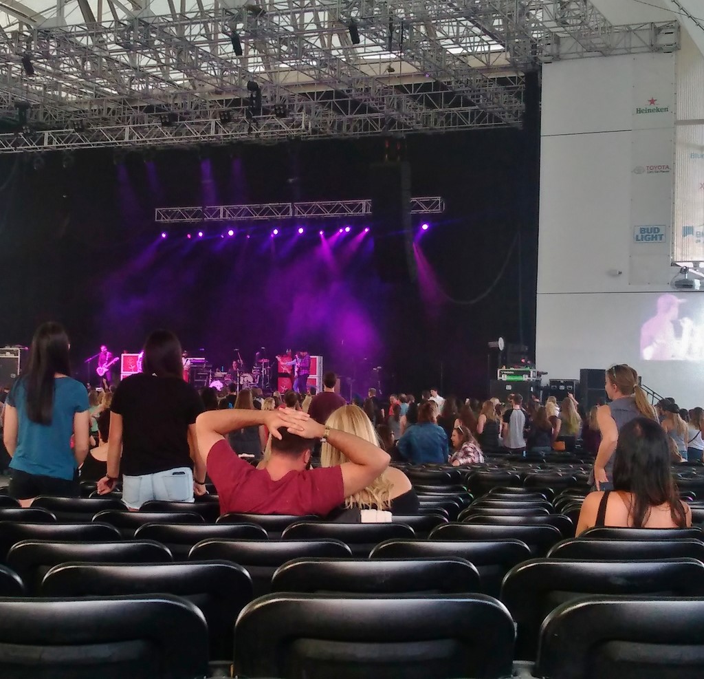 Le jour venu, nous revenions de Cambridge après avoir visité la prestigieuse Harvard University. Lorsque nous avons pénétré dans l’enceinte du BOA Pavilion (photo), nous avons eu la désagréable surprise de constater que le groupe The Social Animals avait déjà commencé son show. Pourtant, il n’était pas encore 19h00, heure prévue du début du concert. Heureusement, nous étions en avance et n’avons loupé que quelques minutes. Ils ont joué jusqu’à 18h50. Nous sommes alors allés nous balader un peu dans le vaste espace devant l’amphithéâtre où se tenaient divers stands, en attendant le groupe suivant que nous pensions être The-All American Rejects, comme prévu. Or, nous avons eu une très bonne surprise en consultant le programme du concert affiché dans l’un des stands : nous avons réalisé avec bonheur que contrairement à ce qui était prévu, The Maine figurait sur la liste... comme pour le concert de Central Park à New-York ! Voilà pourquoi The Social Animals avaient commencé à 18h30 au lieu de 19h00. Du coup, The Maine jouait à 19h00. Encore un heureux imprévu lié à ce concert !