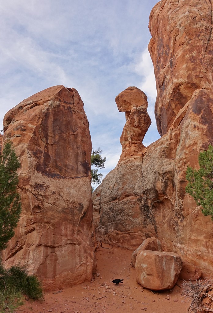 Cette année, nous avons visité un endroit différent du parc, situé au Nord. Nous avons fait le Devil’s Garden Trail (photo), randonnée classée difficile. Long de 11.5 kilomètres, il regroupe une huitaine d’arches, notamment Landscape Arch, l’une des plus grandes au monde, qui étonne cependant par la finesse de sa silhouette. Il est dangereux et interdit de s’en approcher à cause de chutes de pierres. Double O Arch est très singulière : elle ressemble à un «8» géant gravé dans la pierre rouge. Les paysages traversés sont fantastiques, mais ils se méritent. Certains passages sont plutôt ardus, parfois un peu vertigineux. La chaleur peut être une difficulté supplémentaire. Les précautions d’usage lors de traversées de zone désertiques s’appliquent naturellement. N’hésitez pas à vous munir d’un plan (disponible au début du trail) pour ne pas vous égarer. En tout état de cause, suivez scrupuleusement les cairns, ces petits monticules de pierres facilement reconnaissables.