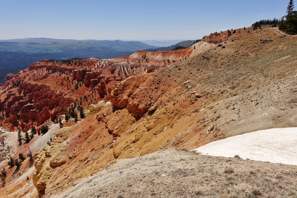 Comme Red Canyon, ce modeste parc est surnommé «Little Bryce» du fait de sa ressemblance avec Bryce Canyon. En effet, il s’agit également d’un amphithéâtre naturel aux couleurs rouge, orange et ocre composé de hoodoos. Des sapins viennent y apporter leur lot de verdure qui contraste parfaitement avec les teintes chaudes des formations rocheuses, auxquelles s’accrochent fermement quelques pins de Bristlecone, connus pour leur longévité et leur résistance. Une route scénique d’environ 8 kilomètres longe les falaises et offre de superbes points de vue. Situé à plus de 3000 mètres d’altitude au cœur de la Dixie National Forest, nous y avons trouvé un peu de fraîcheur sur la route entre Moab et Hurricane, écrasée de chaleur. Il y avait même des restes de neige, ce qui conférait à l’endroit une beauté fascinante.
